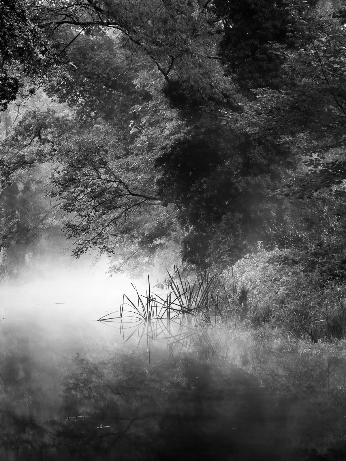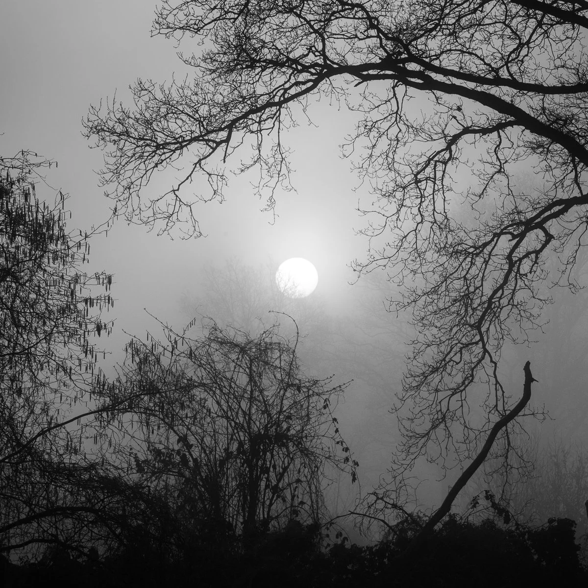 Een selectie van sfeervolle zwart-wit landschapsfoto’s van Landgoed Hackfort. De focus ligt op de bomen en bossen op het landgoed.